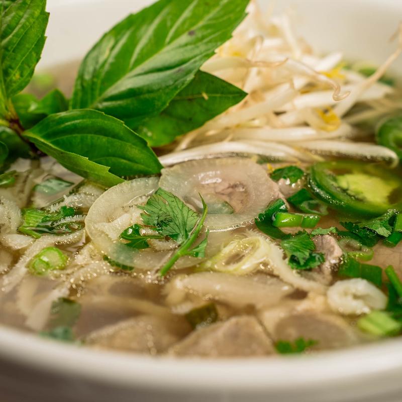 Vietnamese national beef or chicken bone broth or veggie noodles soup. Served with onion, scallions, cilantro, bean sprouts, basil, and jalapeño. Soup, noodles, and sides are packed separately so folks can enjoy them freshly at home. Reheat the broth; the hotter it is, the better, just like how we serve at our location.