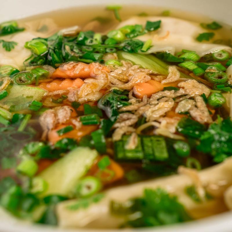 Veggies/chicken dumplings soup, wontons (pork & shrimp) soup, or beef meatball soup are gently simmered in chicken, beef, or vegetable broth with seasonal vegetables.