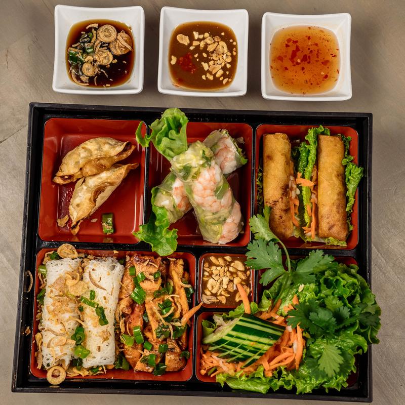 Combo platter includes one fresh hand-roll summer roll cut into 1/2 pieces, two crunchy spring rolls, and two steamed or fried dumplings. Served with rice, fried rice, vermicelli, fine vermicelli, or Vietnamese salad with your choice of grilled chicken, grilled pork, grilled beef, grilled shrimp, or veggies & tofu. Sampling all the goodies with homemade sauces: fish sauce, soy sauce, and plum sauce.