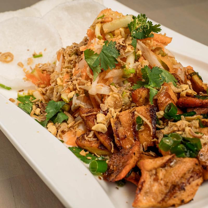 Lotus root, fresh apples, homemade pickled carrot & daikon, fried garlic in the special homemade dressing; finally topped with mints, cilantro, and peanuts. Protein choices of steamed or grilled shrimp, grilled chicken, pork, beef, or tofu. What's unique about this light and healthy dish is that it's served with rice crackers. Enjoy each bite of rice cracker, which is filled with a mixture of fresh salad and your favorite choice of protein.